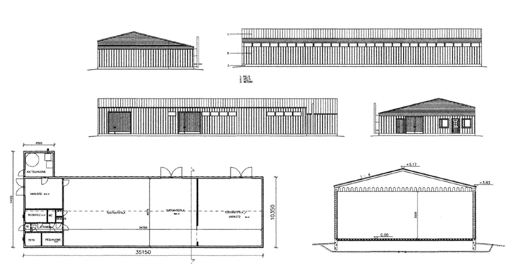Huoneistoselitelmä | Teollisuushalli + varastotila + keittiö + pukuhuone + wc + kattilahuone + varastohalli |