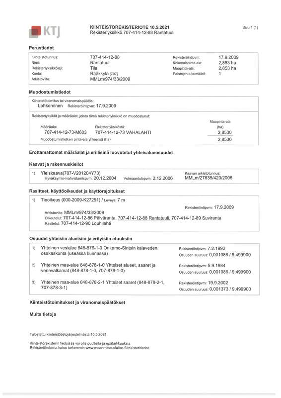 | Lisätietoja rakennusoikeudesta | Loma-asunnon rak.oikeus 150 m2 tai omakotitalon 300 m2 |